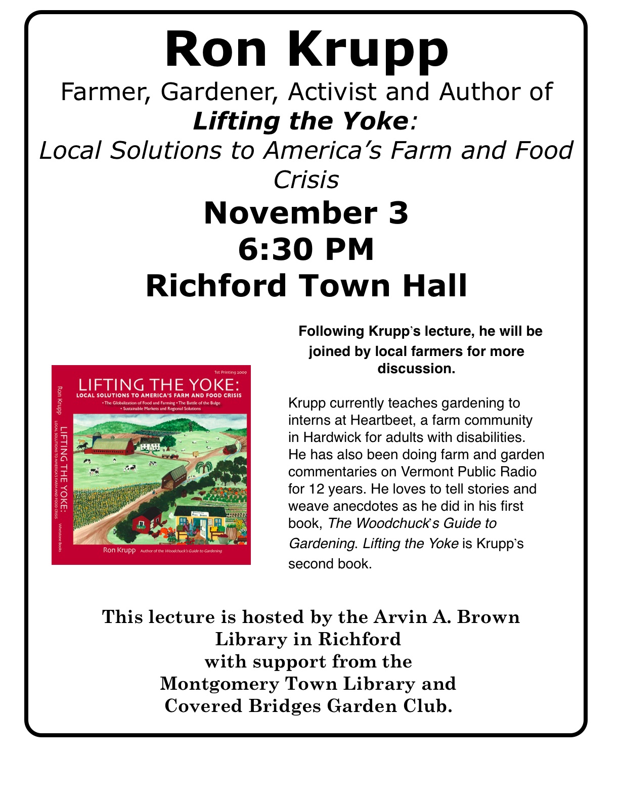Vermont author, farmer and gardener Ron Krupp will speak will speak on Wednesday, Nov. 3, at 6:30 p.m. at the Richford Town Hall, in an event sponsored by the Arvin A. Brown Library and supported by the Montgomery Town Library and Covered Bridges garden Club . Following Krupp’s lecture, he will be joined by local farmers for more discussion.